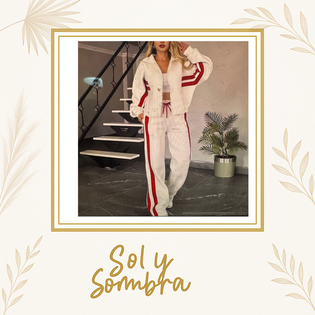 Este conjunto combina comodidad y estilo deportivo en una silueta moderna. Fabricado en tela suave y ligeramente elástica, incluye una chamarra con cierre al frente y dos franjas de diferente color en las mangas, que aportan un toque dinámico y juvenil. El pantalón de corte recto presenta líneas laterales rojas y ajuste con cordón en la cintura, logrando una mezcla perfecta entre lo casual y lo chic.